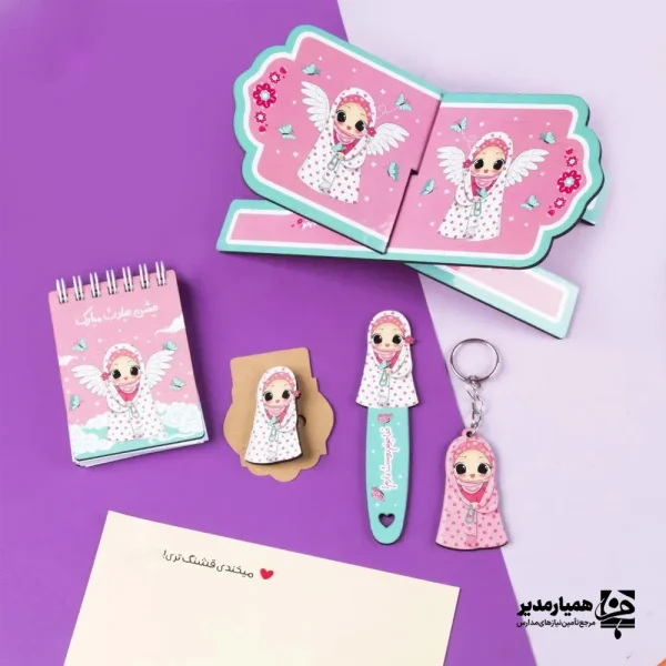 🎀 پک جشن عبادت ویژه دختران، شامل رحل چوبی، دفترچه یادداشت سیمی، سرکلیدی، نشانگر کتاب و پیکسل چوبی — هدیه‌ای معنوی و ماندگار برای جشن عبادت و سن تکلیف. 🌸