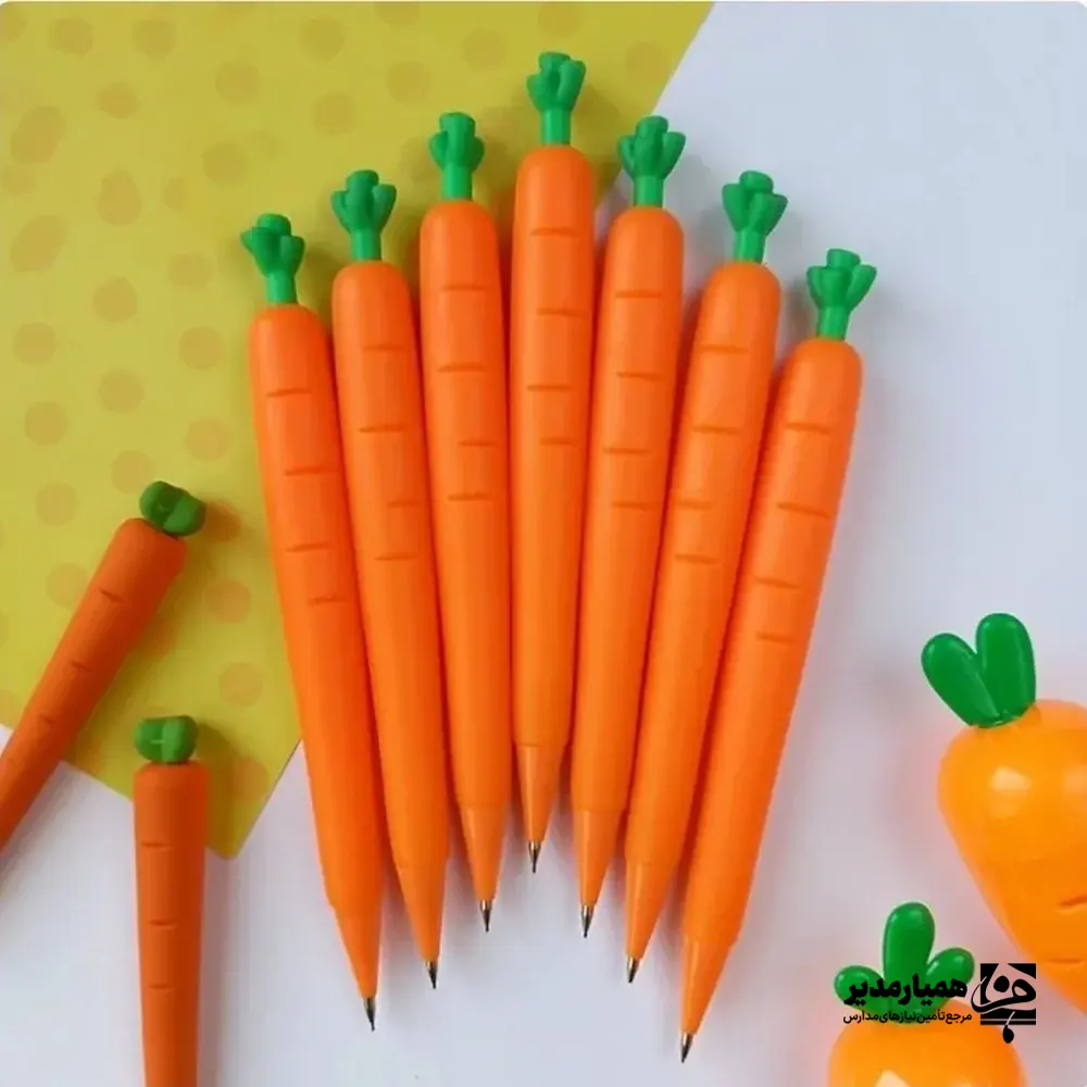 اتود طرح هویج با رنگ نارنجی روشن و برگ سبز ، یادآوری از طبیعت و سبزیجات تازه است. 🍃 ظاهر جالب و متفاوت آن، شور و نشاط را به یادگیری و نوشتن تکالیف دانش آموزان میآورد.