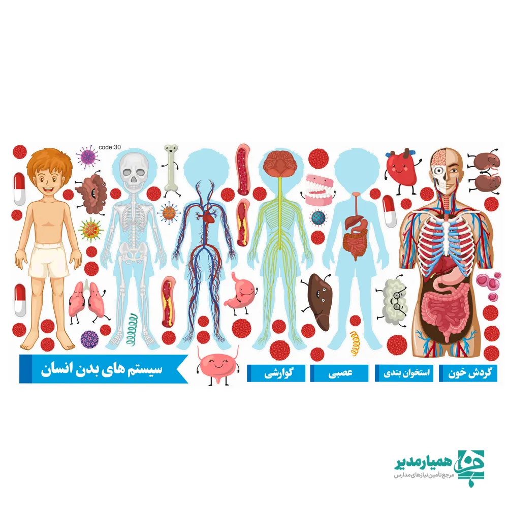 استیکر آموزشی «سیستم‌های بدن انسان» با طراحی کارتونی و رنگارنگ شامل اندام‌ها و سیستم‌های اصلی بدن مانند گردش خون، گوارشی، عصبی و استخوان‌بندی، همراه با طرح‌های بامزه ویروس، سلول و دارو، مناسب برای آموزش علوم به کودکان در مدارس و مهدکودک‌ها.