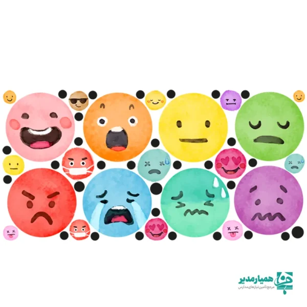 استیکر آموزشی شکل احساسات با طراحی رنگارنگ و چهره‌های خندان، ناراحت، عصبانی و… مناسب آموزش هیجانات و شناخت احساسات در کلاس‌های مدارس، مهدکودک‌ها و مراکز تربیتی.