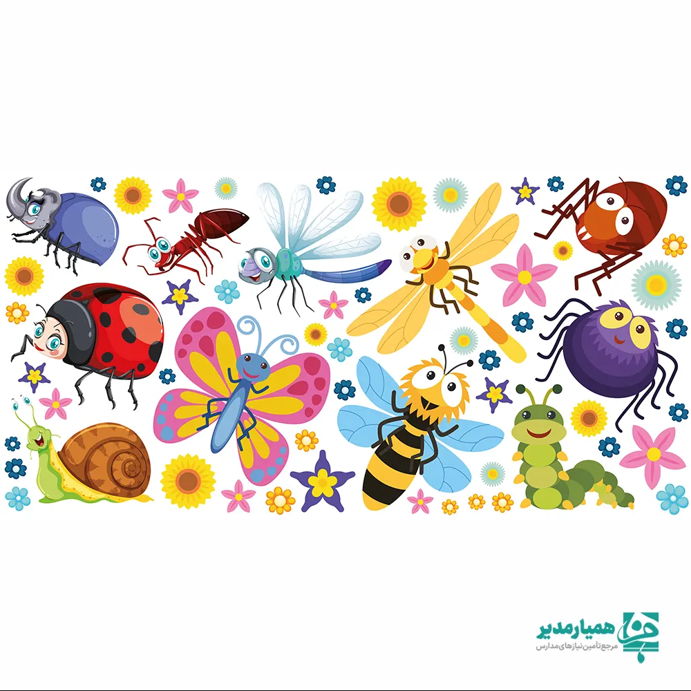 مجموعه استیکرهای رنگارنگ و کارتونی با طرح حشرات بامزه و گلهای شاد، شامل پروانه، کفشدوزک، زنبور، مورچه، ملخ، سنجاقک، حلزون و عنکبوت، مناسب برای آموزش طبیعت و تزئین کلاسهای درس و وسایل کودکان.