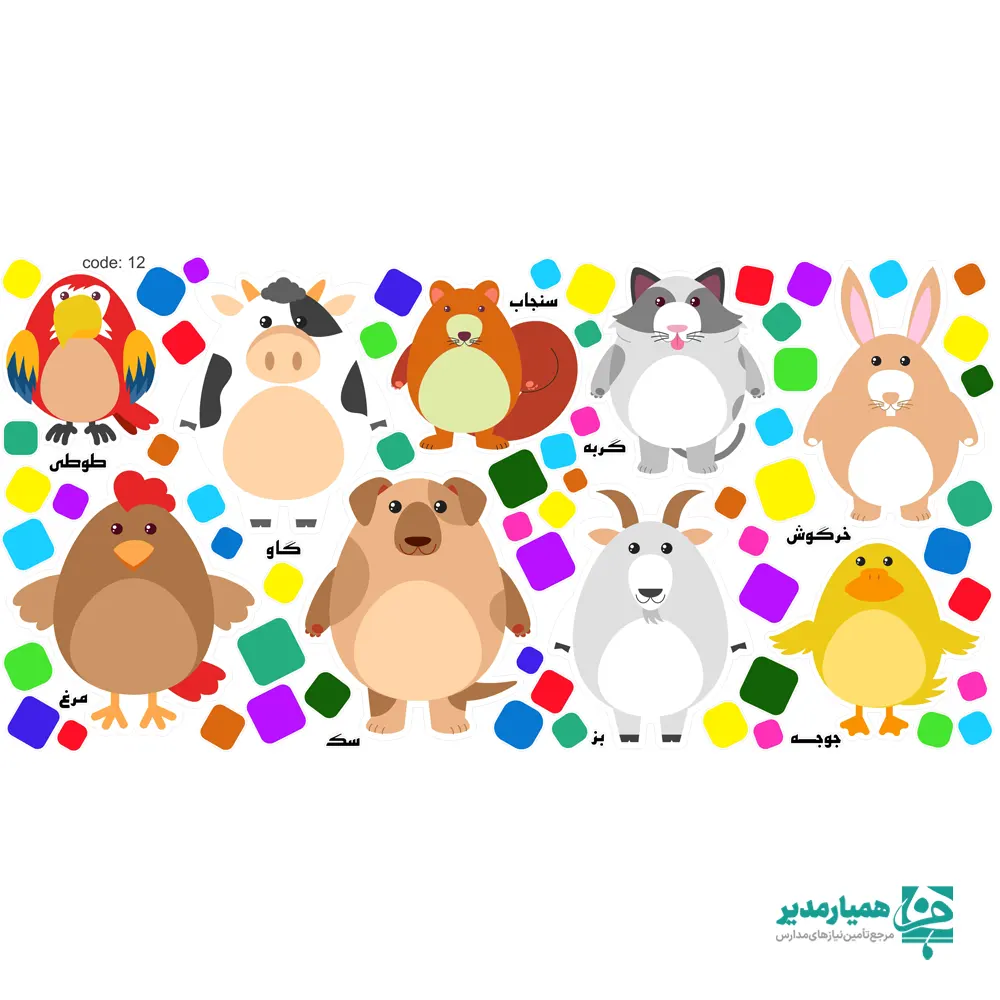 پسزمینه تصویر با مربعهایی رنگی در طیف شاد (آبی، سبز، زرد، قرمز، بنفش، نارنجی، صورتی) تزئین شده که به طرح انرژی و جذابیت بیشتری میبخشد. این مجموعه استیکر برای آموزش نام و شناسایی حیوانات به کودکان، تزئین کلاس درس و مهدکودک، تزیین وسایل شخصی مانند دفتر و کیف و حتی برای پروژههای هنری و کاردستی بسیار مناسب است.