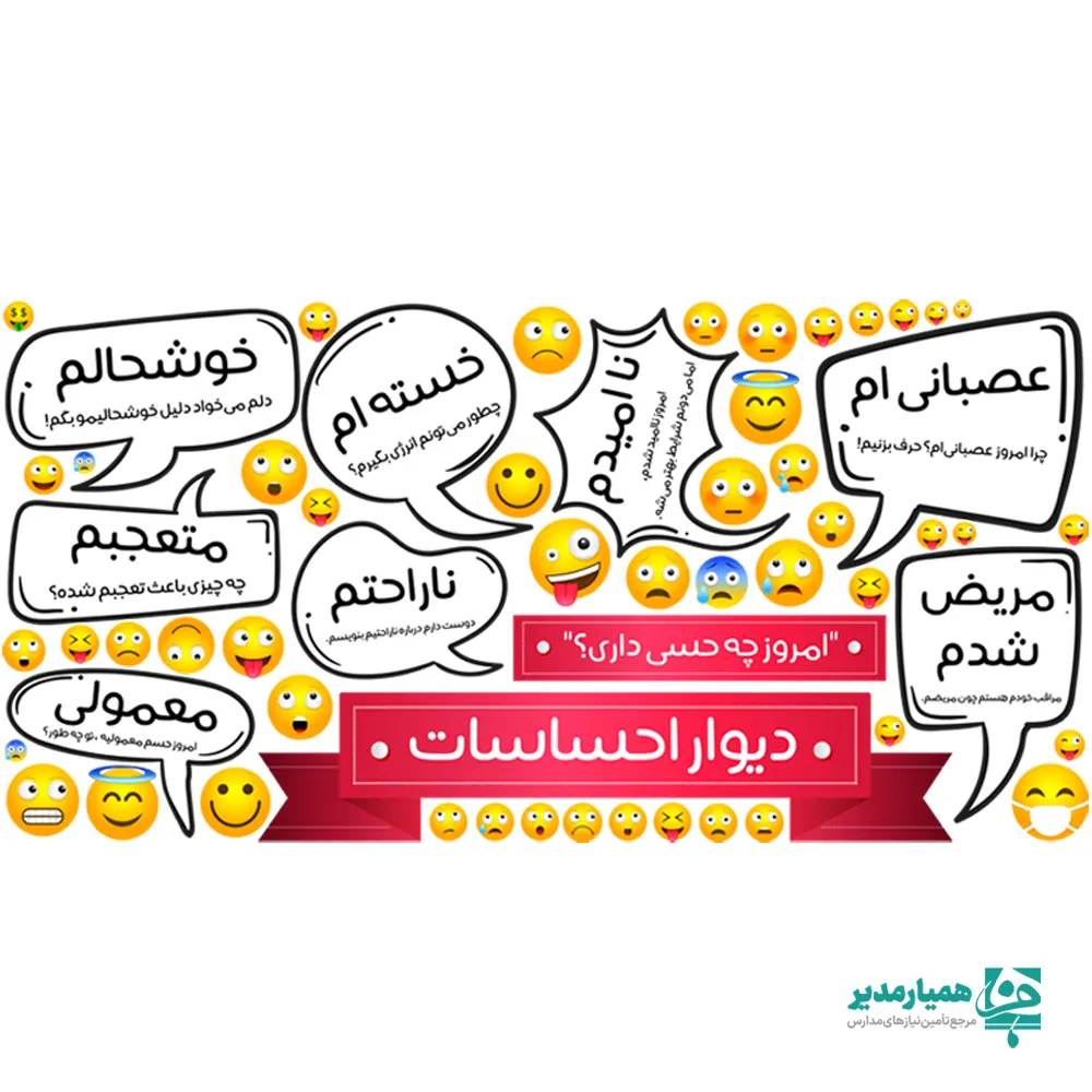 استیکر دیوار احساسات با طراحی جذاب و استفاده از متن و ایموجیهای متنوع، مناسب آموزش و بیان هیجانات روزانه در کلاسهای درس