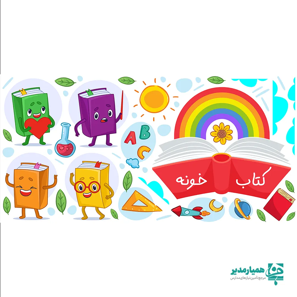 در کنار این شخصیتها، عناصری از دنیای کودکانه و آموزشی دیده میشود: لوله آزمایش علمی، حروف الفبای انگلیسی، خطکش و گونیا، خورشید، ماه، سیاره، موشک، برگهای سبز، و یک رنگینکمان بزرگ که بالای کتاب باز با عبارت فارسی «کتاب خونه» قرار دارد.