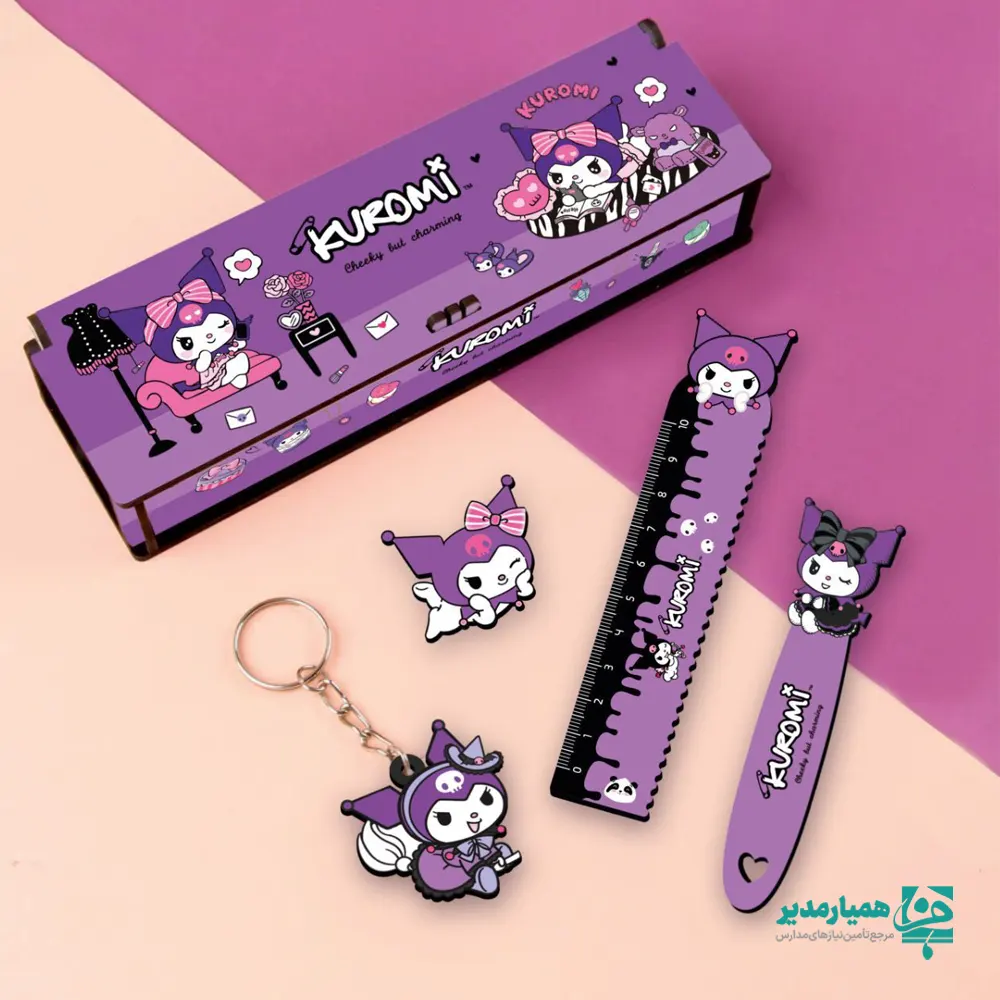 🎀 ست ۵ تکه فانتزی طرح Kuromi شامل جامدادی، سرکلیدی، نشانگر کتاب، پیکسل سوزنی چوبی و خطکش — هدیهای کامل و دوستداشتنی برای علاقهمندان لوازمالتحریر خاص. 💜