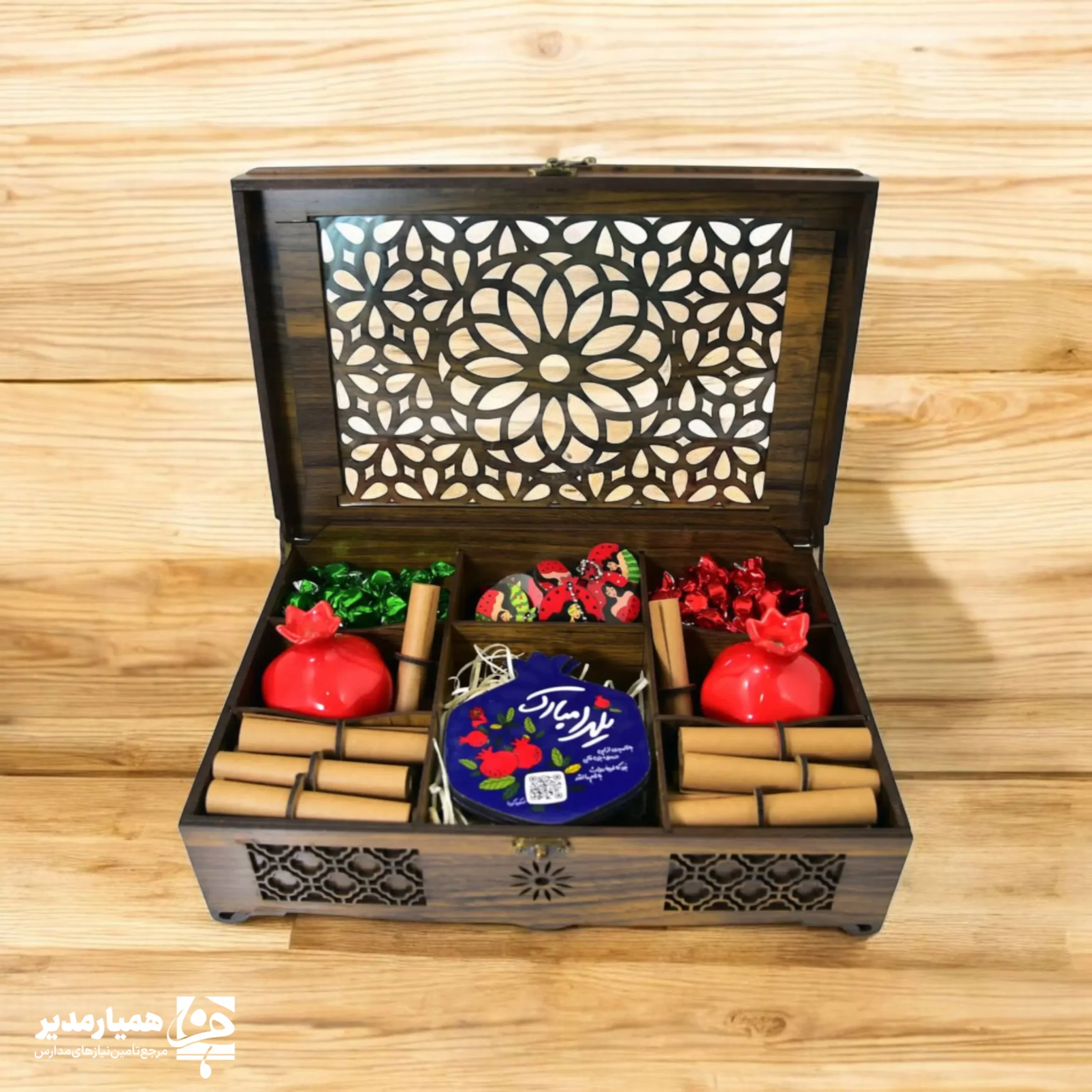 🎁 جعبه سنتی ویژه مدیران مدارس، انتخابی فاخر و فرهنگی برای هدیه شب یلداست 🍉✨. طراحی تمامچوب با نقوش اسلیمی، جلوهای اصیل و ایرانی به این هدیه داده و درون آن پر از المانهای نمادین و دلنواز یلدایی است 💖.
