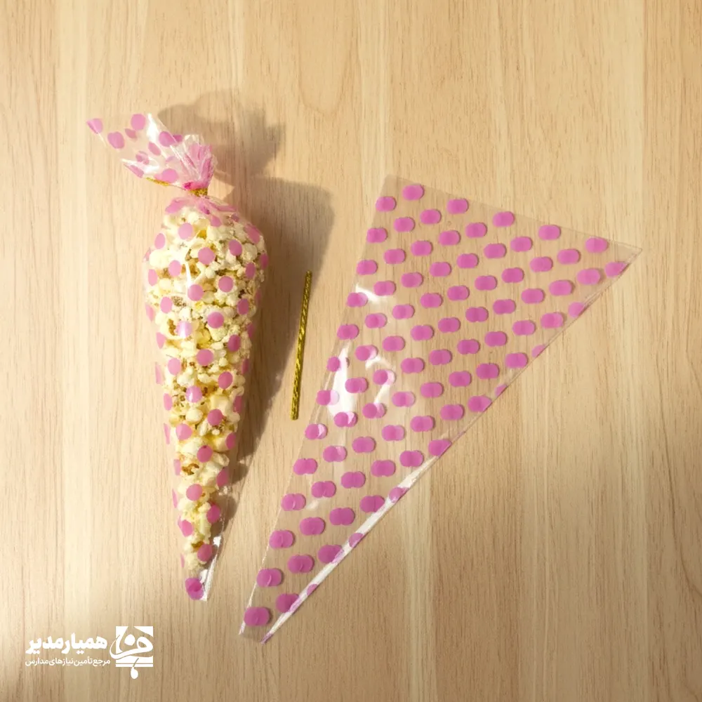کیسهی قیفی با طرح خالدار و جنس نایلون شفاف، مناسب برای بستهبندی پفک، پفیلا و خوراکیهای هیجانانگیز دانشآموزان است. طرح پرانرژی و رنگ گرم آن برای <b>جشنها و برنامههای تشویقی مدرسهای</b> فوقالعادهست 🎉