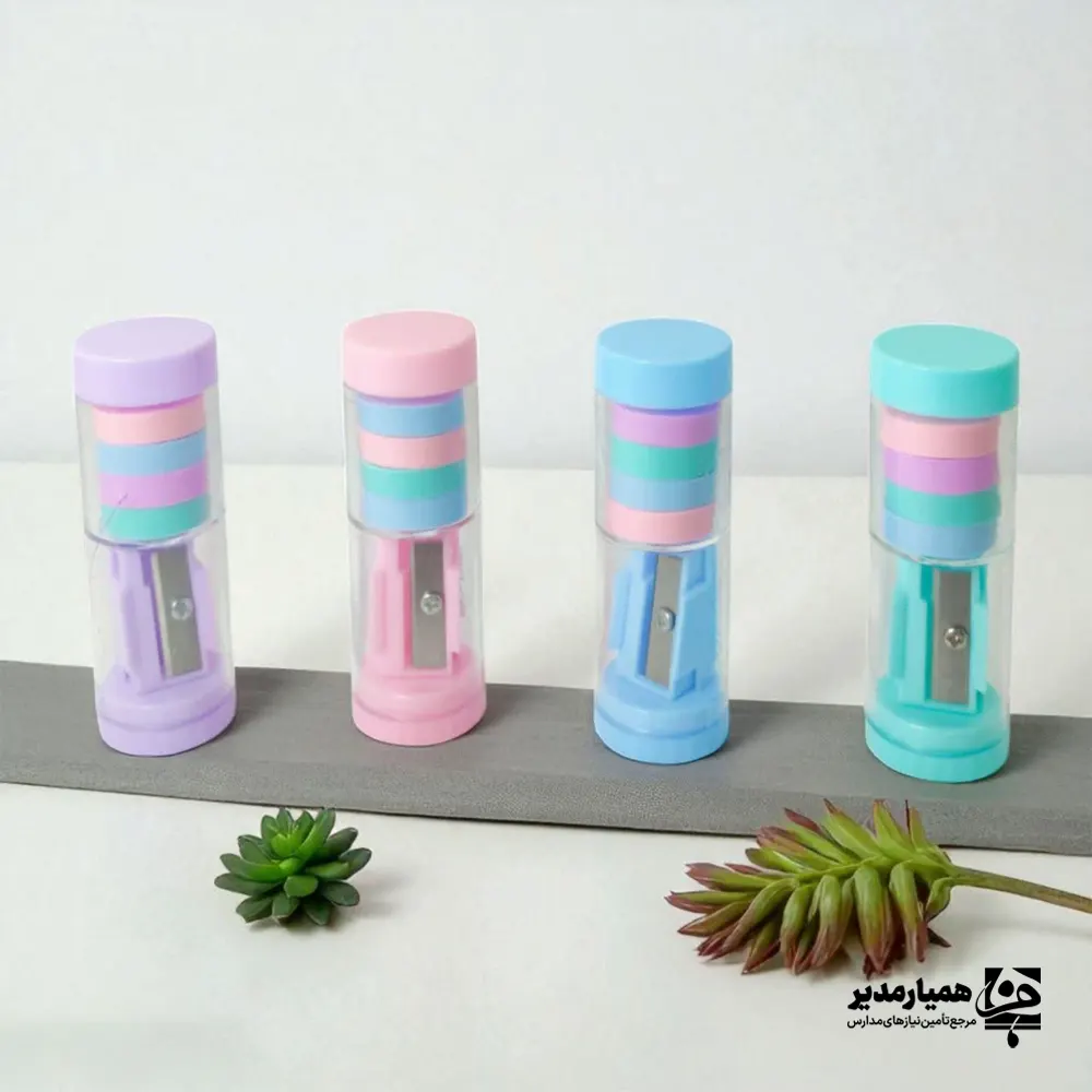 این محصول چندکاره، ترکیبی از تراش مداد با مخزن جمعآوری تراشهها و پاککن باکیفیت در یک طراحی پاستلی جذاب است. رنگهای آرام و ملایم آن، حس زیبایی و نظم را به میز تحریر یا کیف مدرسه میبخشند.