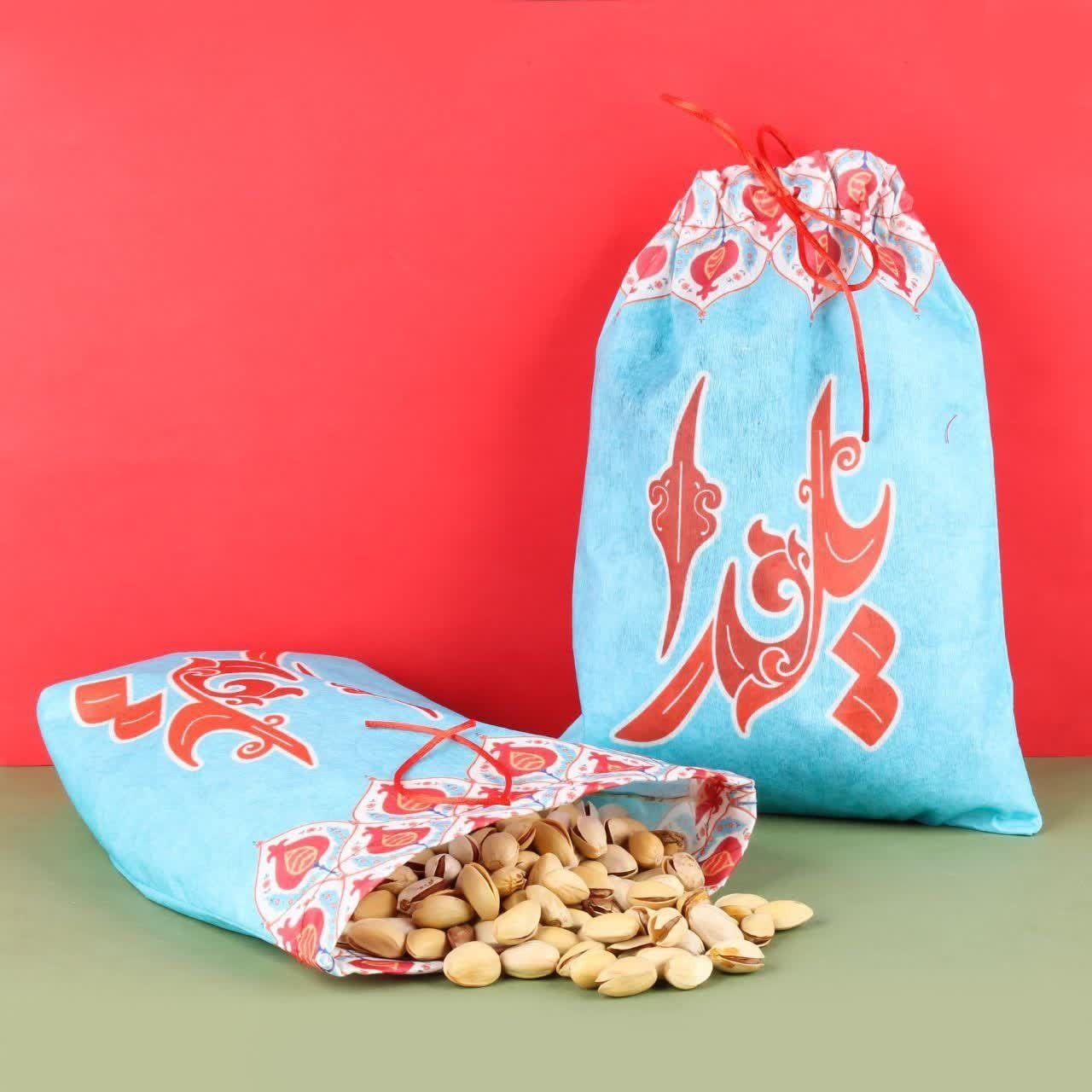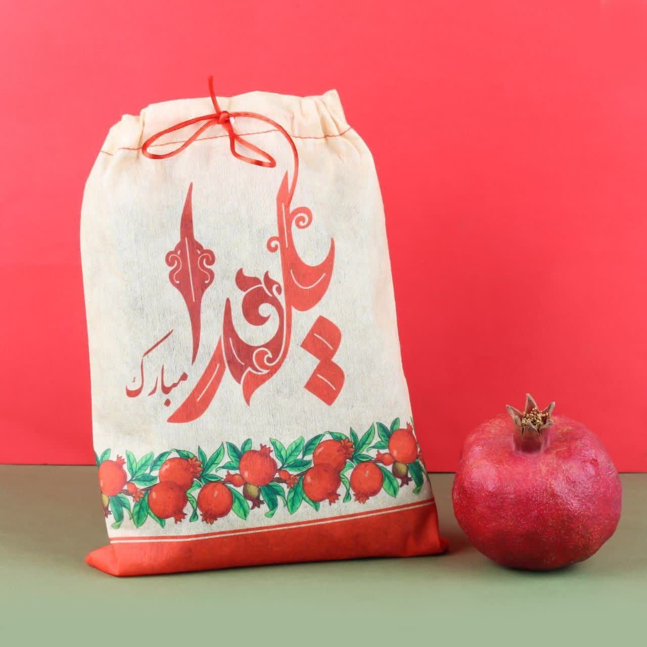 طرحهای خوشنویسی بر روی کیسه، جلوهای فرهنگی و اصیل به آن میدهند و ترکیب رنگهای قرمز و کرم حس گرما و صمیمیت بلندترین شب سال را تداعی میکند.