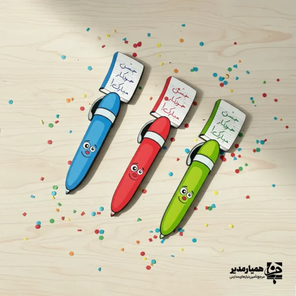 ✏🎉 نشانگر جشن خودکار با طراحی خودکار رنگی و لبخند شیرین، هدیهای شاد و ماندگار برای جشن اولین خودکار دانشآموزان پایه سوم.