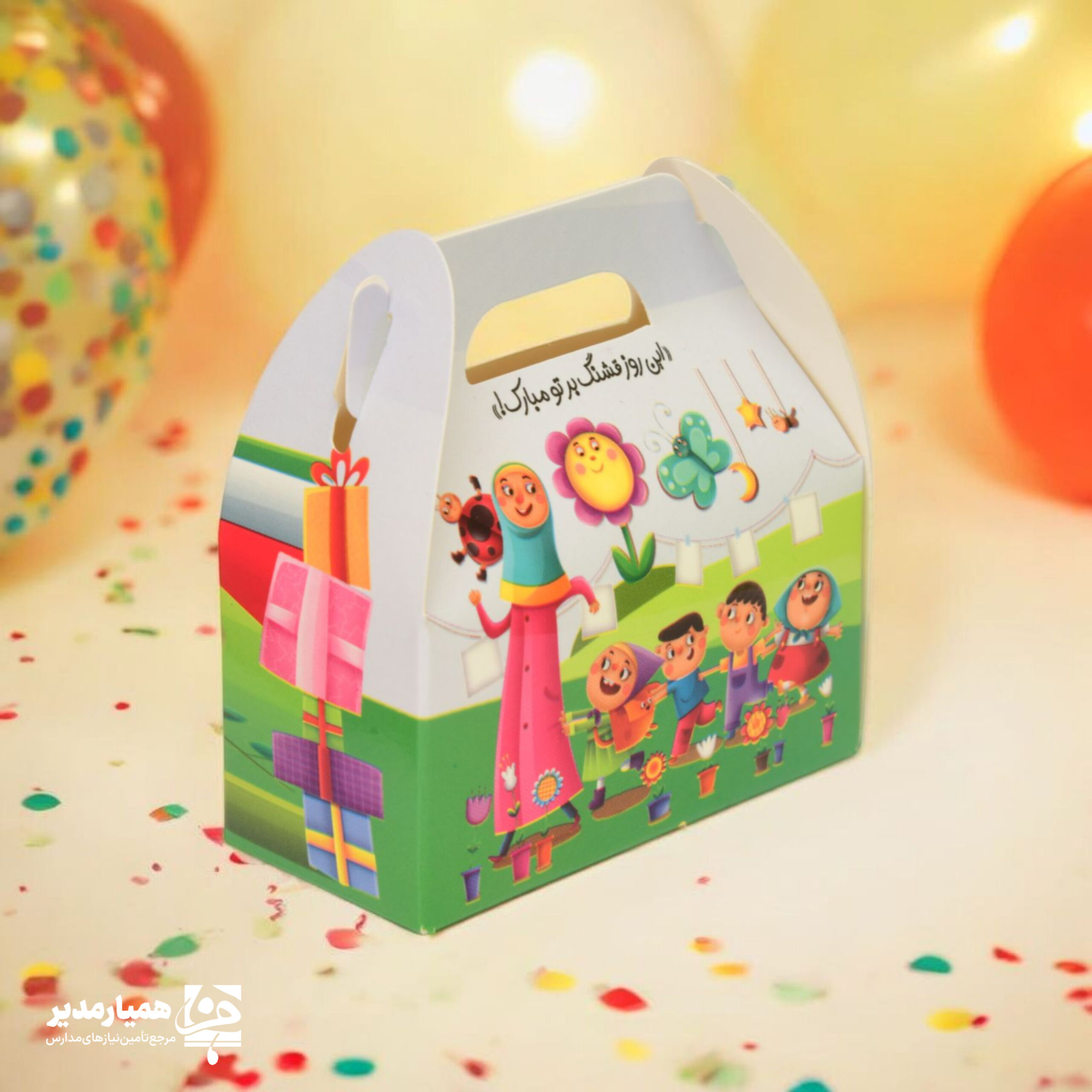 بر روی جعبه پیام محبتآمیز «این روز فرخنده بر تو مبارک باد» دیده میشود که حال و هوای تبریک و تشویق را به فضای مدرسه میافزاید. این جعبه سبک و زیبا، برای بستهبندی شکلات، پفک، بیسکویت و خوراکیهای کوچک طراحی شده و هدیهای شیرین از سوی معلم یا مدیر مدرسه به دانشآموزان محسوب میشود.