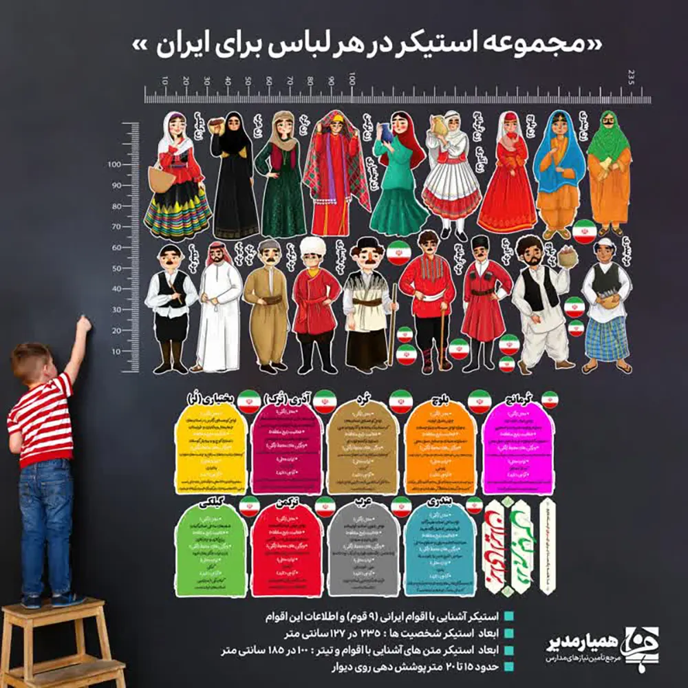 استیکری آموزشی برای مدارس که پوشاک ۹ قوم ایرانی را به شکلی جذاب و دیدنی به کودکان میآموزد.