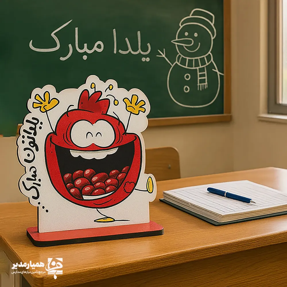 با اندازه‌ی تقریبی ۹ در ۹ سانتی‌متر، گزینه‌ای ایده‌آل برای تزئین میز یلدا، هدیه‌های فرهنگی مدارس و دکور یلدایی اتاق دانش‌آموزان است 🎈.