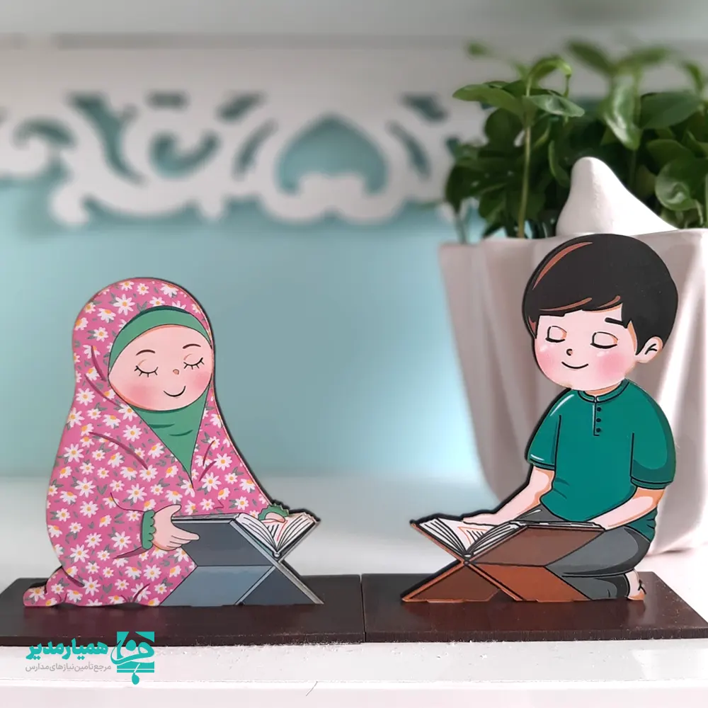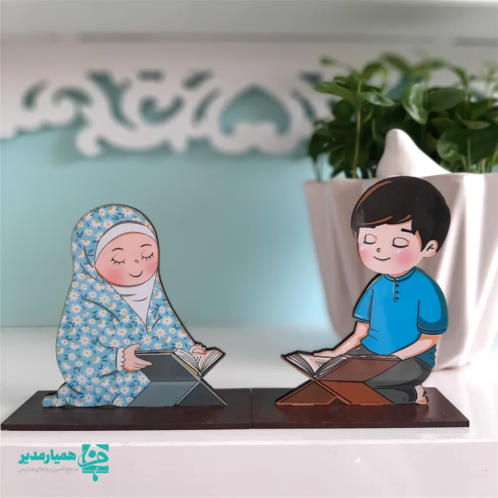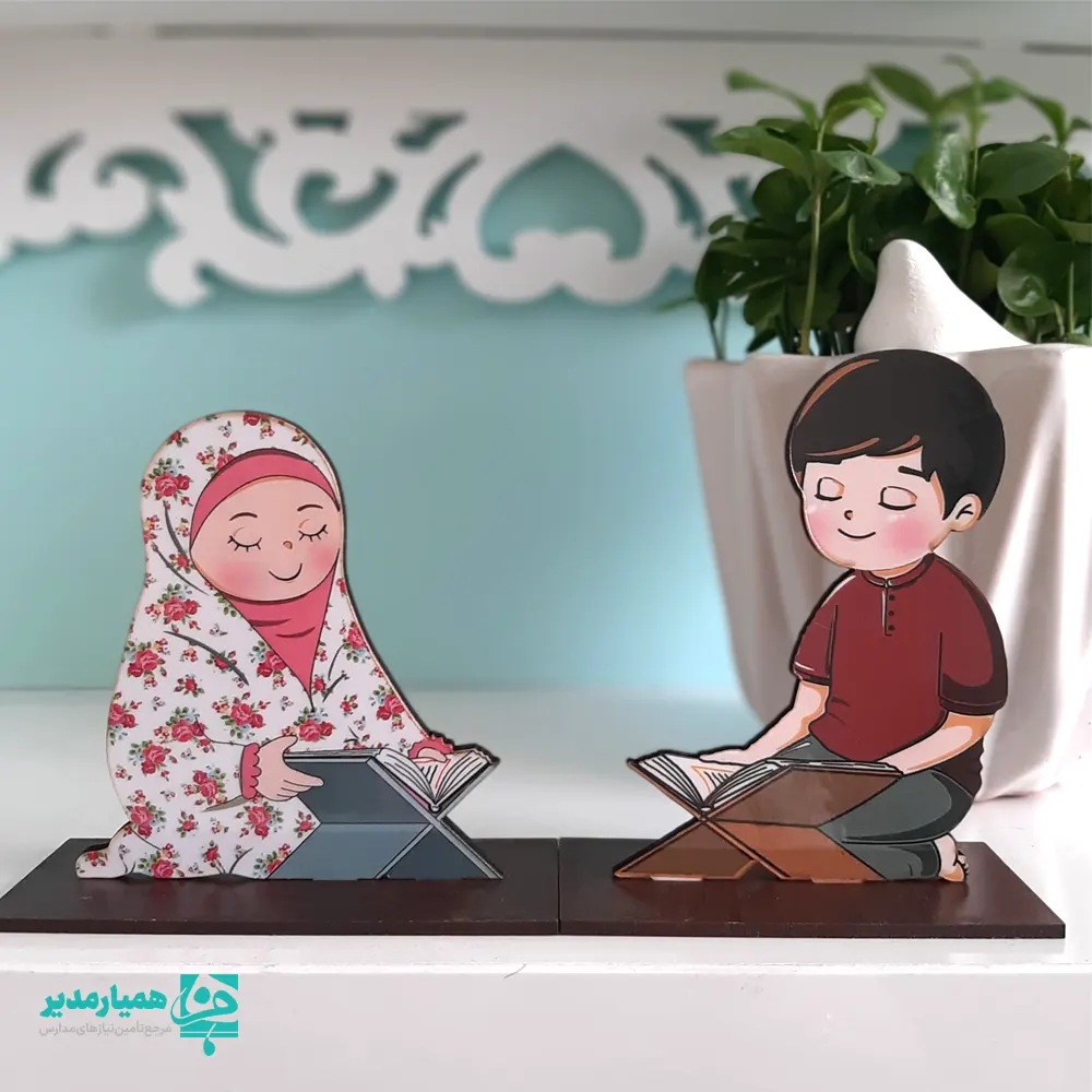 در طراحی این استند، دو کودک در حال قرائت قرآن روی رحل بهصورت فانتزی و دکوراتیو نمایش داده شدهاند — نمادی از حضور قلب، ایمان و زیباییِ آموزش قرآنی در مدارس 🕊️