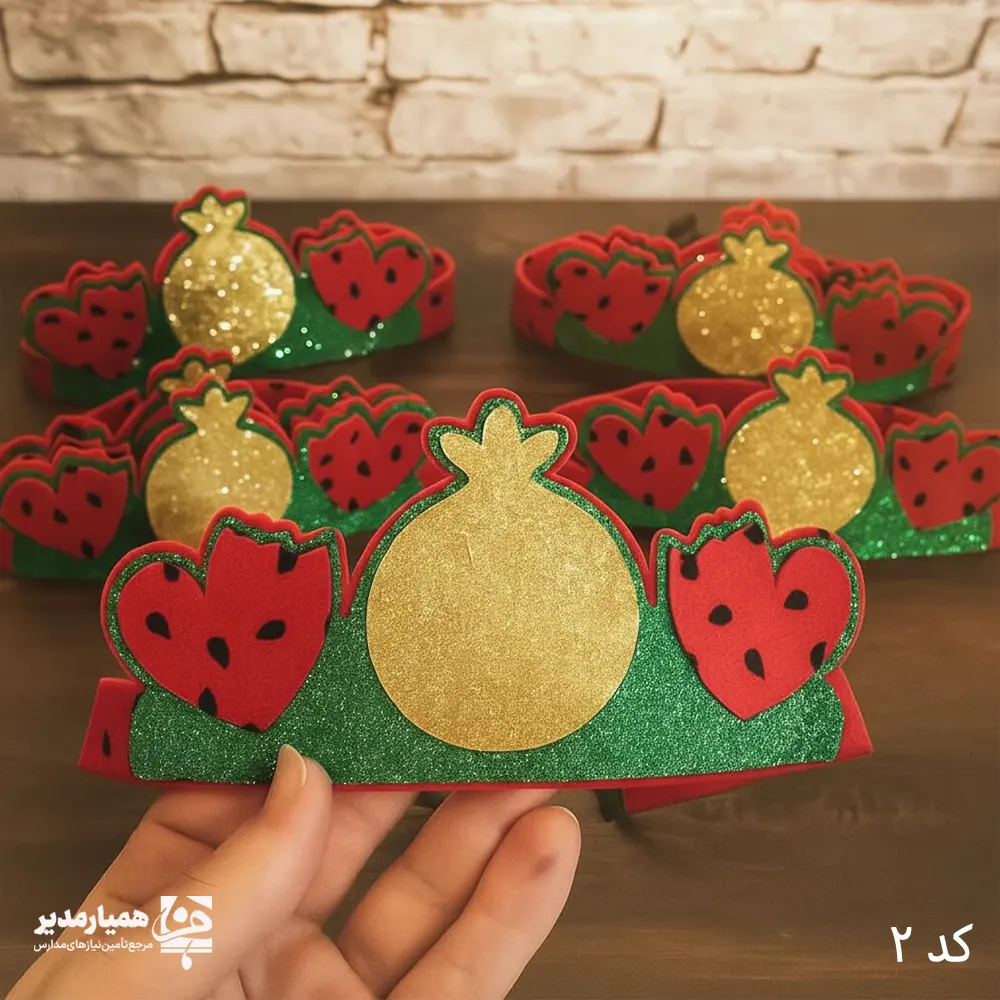 تاج یلدایی با طرح جذاب هندوانه و انار براق در طرح های مختلف انتخابی پرانرژی برای جشن‌های مدرسه است 🍉🎊