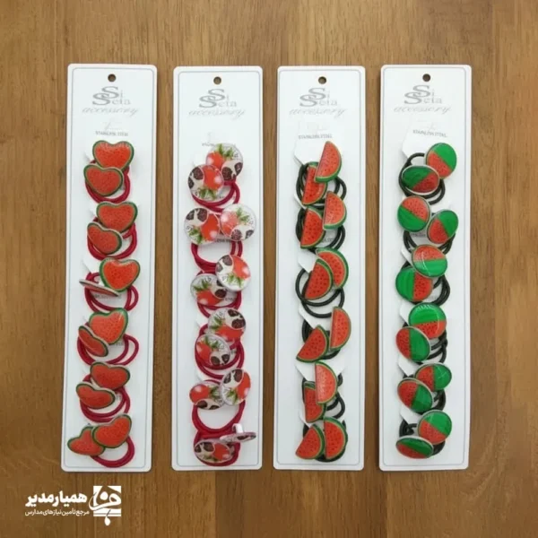 کش یلدایی با طرحهای هندوانه و انار، انتخابی شاد و فانتزی برای شب یلداست. مناسب برای تزئین مو و ست کردن با لباسهای یلدایی دخترانه دانش آموزان 🍉🎉